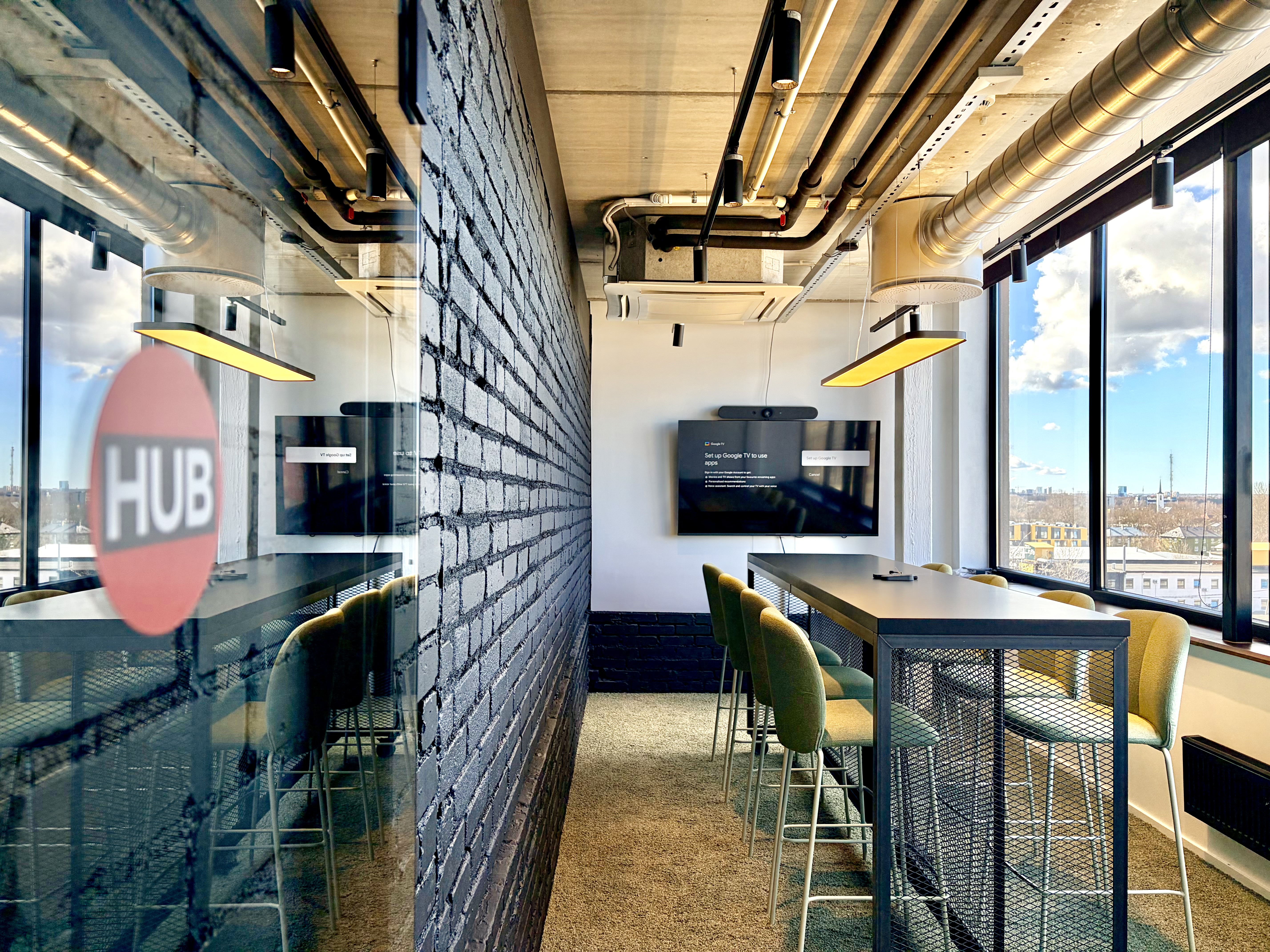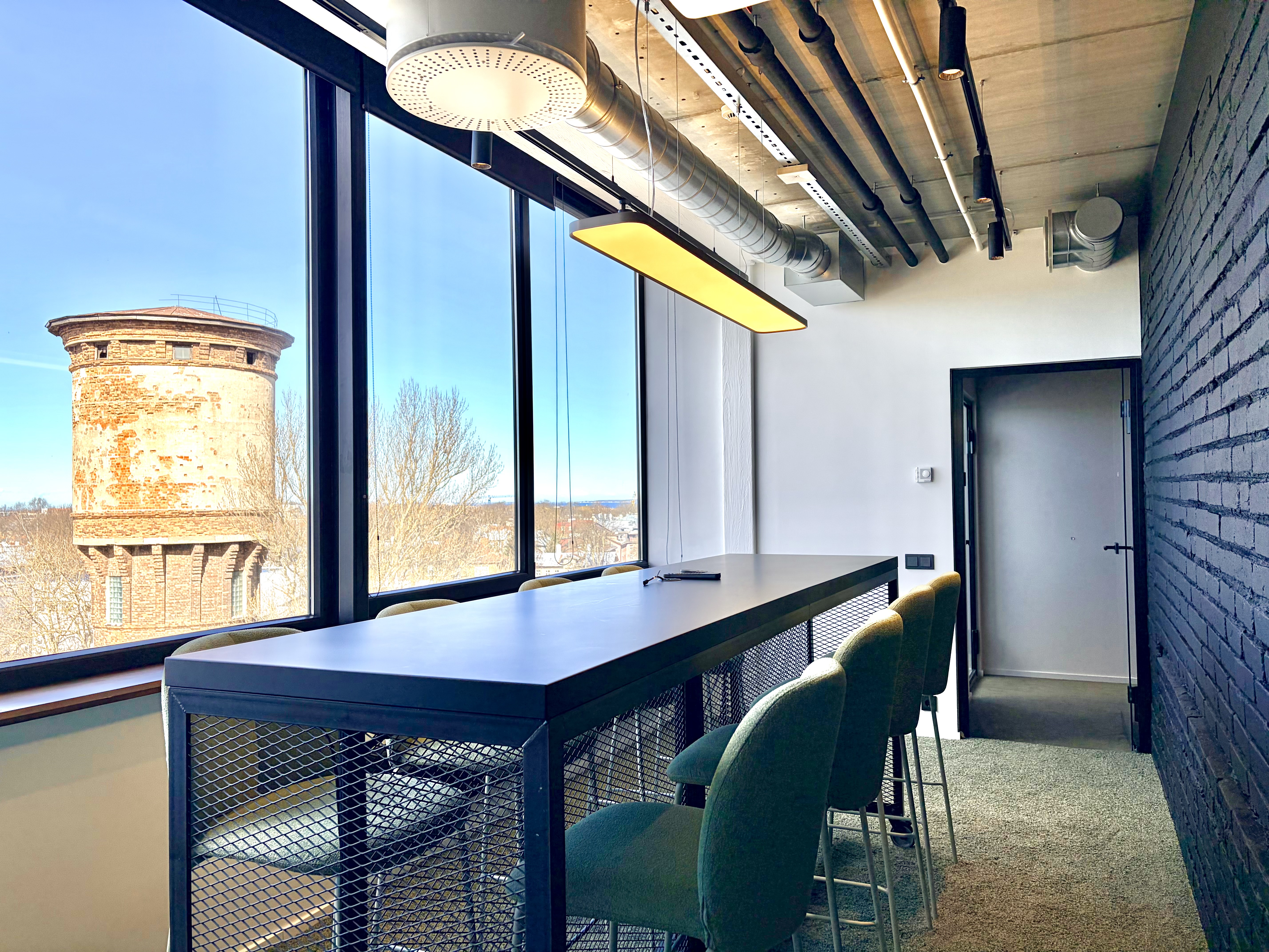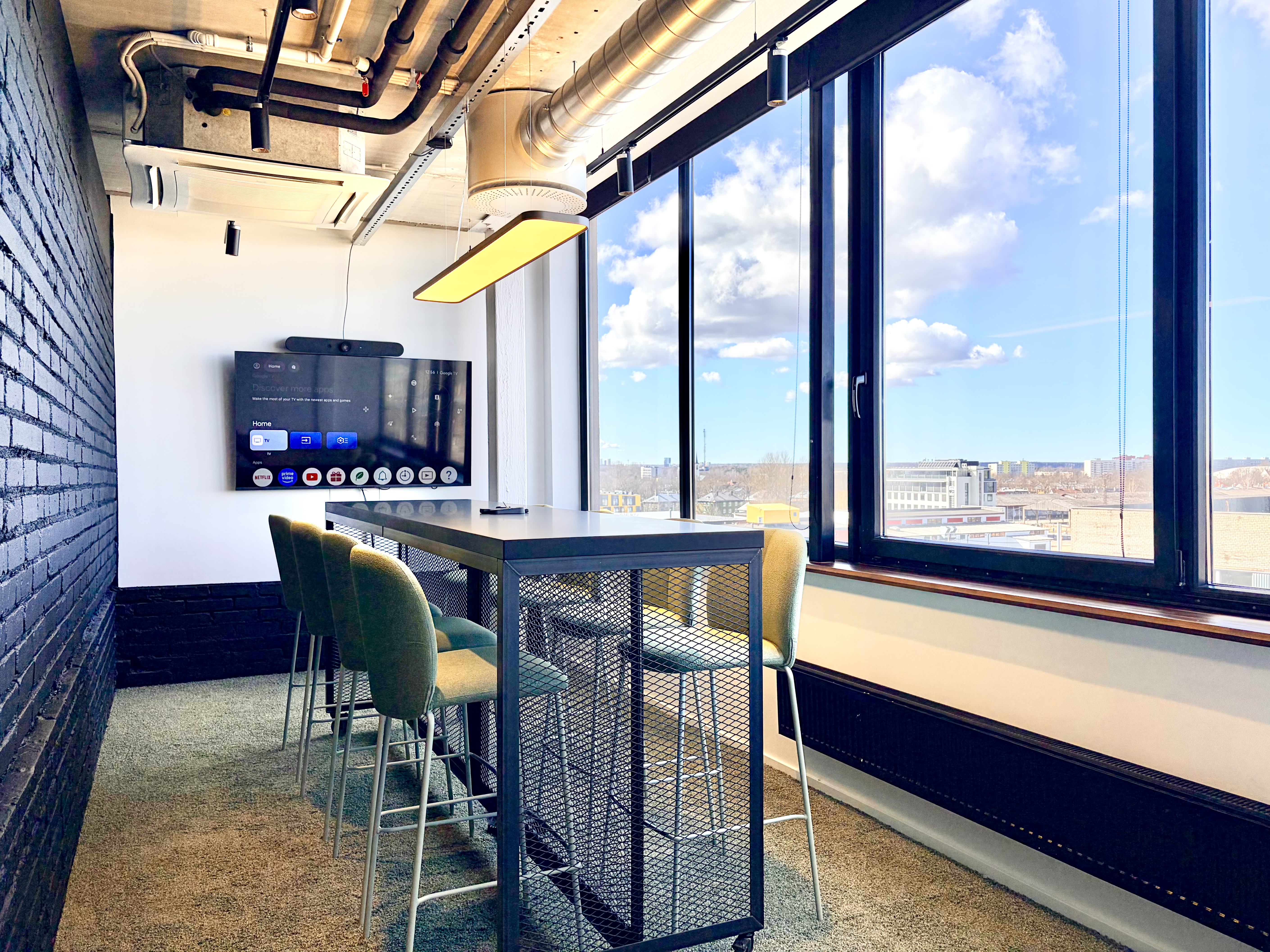 Kõrgem laud ja pukktoolid hoiavad meeled erksad — suurepärane nipp, sest istuva publiku mõttetempo kipub kahanema korrelatsioonis entusiasmi tasemega. Ruumis on olemas ekraan ja videokoosolekute tehnika.