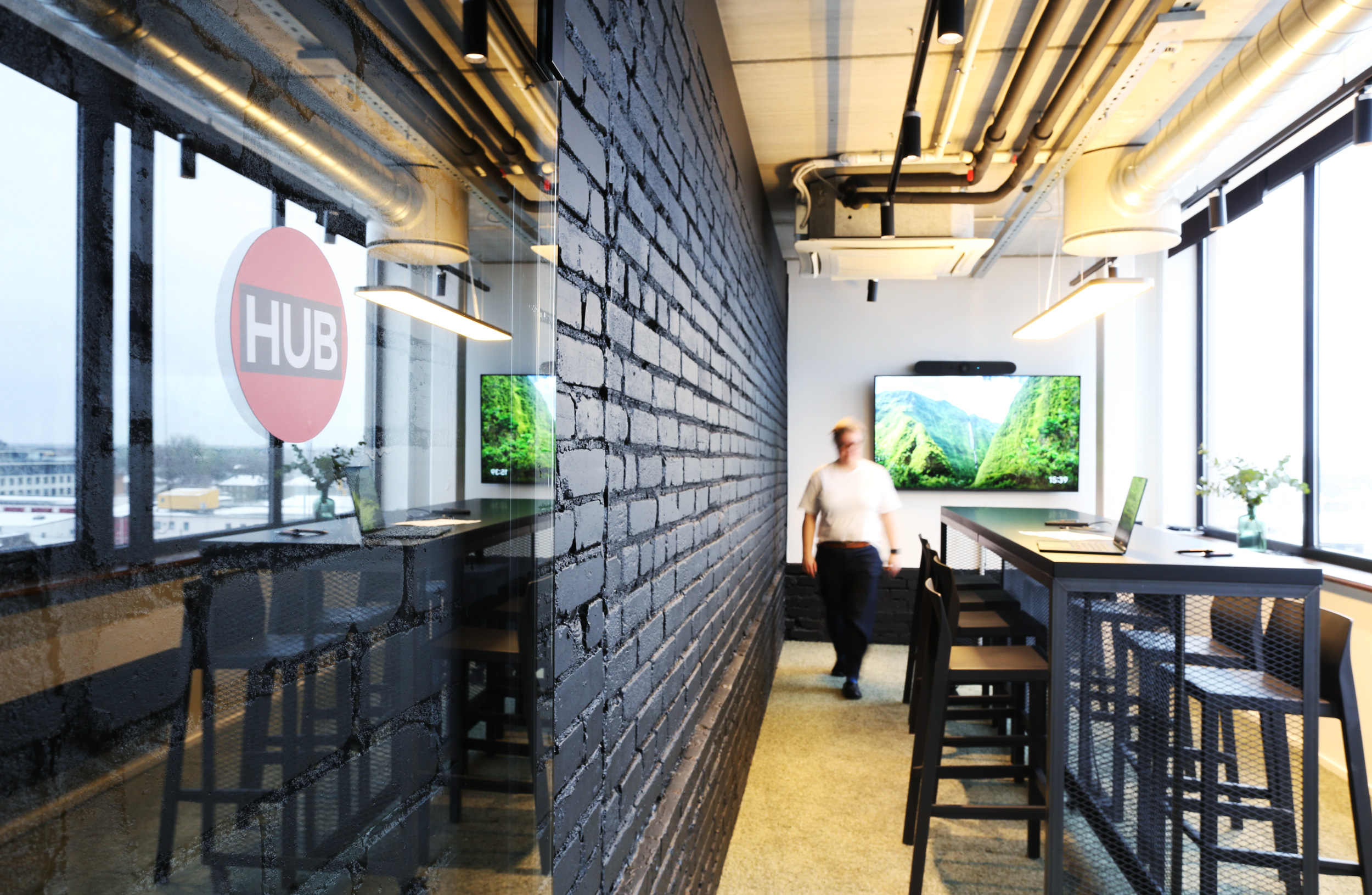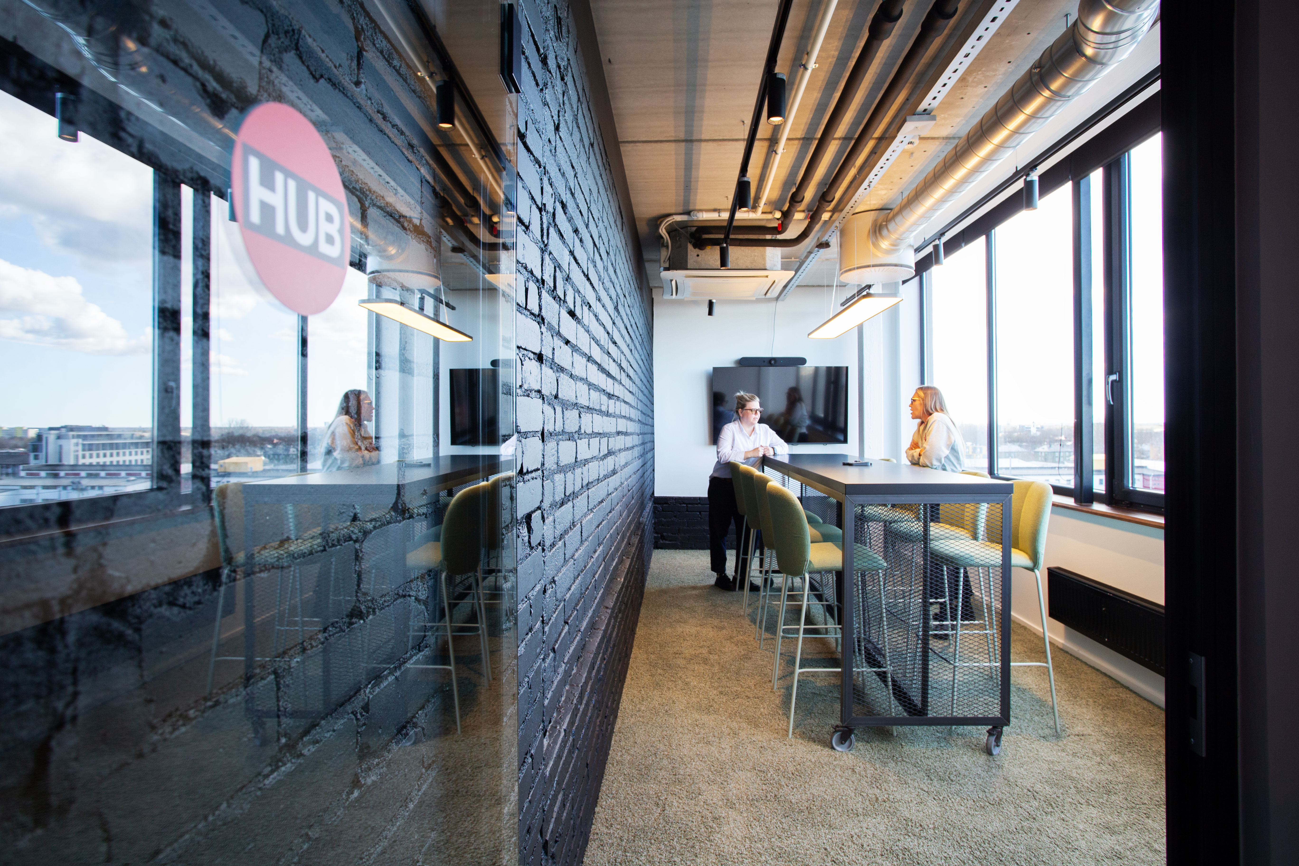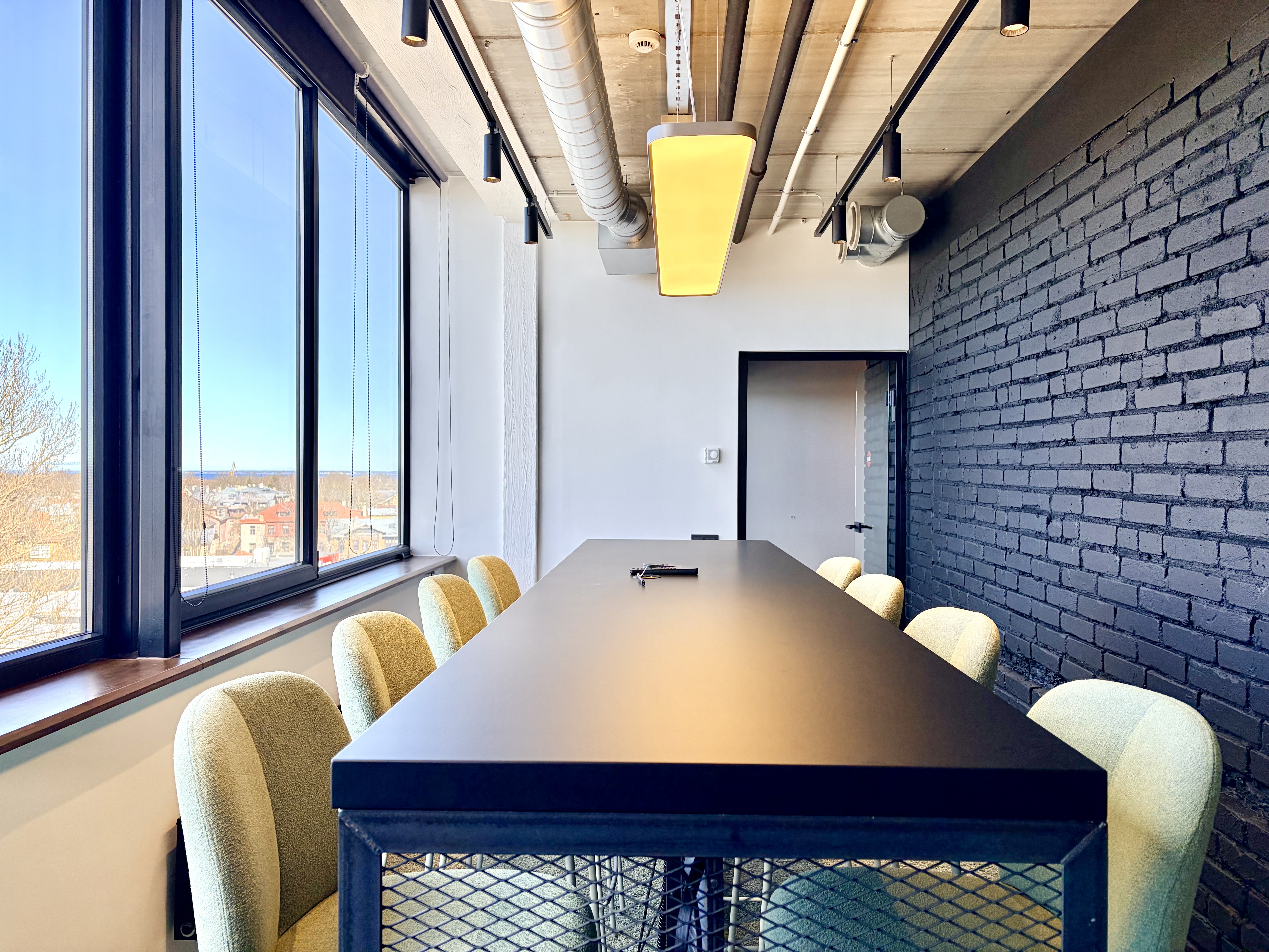 Kõrgem laud ja pukktoolid hoiavad meeled erksad — suurepärane nipp, sest istuva publiku mõttetempo kipub kahanema korrelatsioonis entusiasmi tasemega. Ruumis on olemas ekraan ja videokoosolekute tehnika.